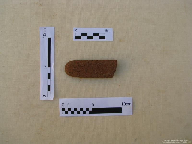 Stan zachowania: Rozcieracz zachowany we fragmencie, jeden z końców uległ zniszczeniu.